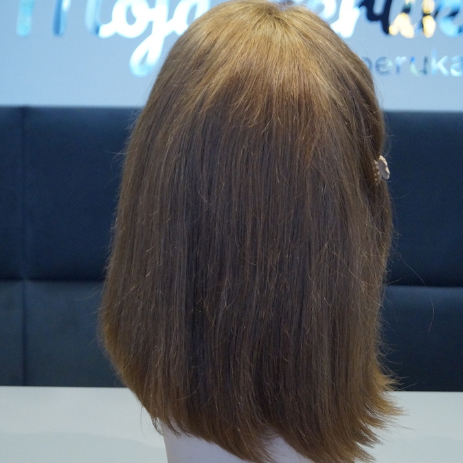 - wykonanie bazy: warstwa front lace, wykonana z siateczki, materiałem bazowym jest tiul w kolorze beżowym. Front lace stwarza naturalne przejście między peruką a linią czoła. Dzięki czemu peruka oddycha. Włosy peruki na warstwie front lace są mocowane ręcznie. Biorąc pod uwagę wszystkie rodzaje czepków - trudno uzyskać bardziej naturalny wygląd niż w przypadku czepka lace front. Ponadto peruka posiada grzebyki, które stabilizują jej ułożenie na głowie. Czepek jest uniwersalny, z regulacją z tyłu oraz z boku głowy, dzięki czemu łatwo dopasujesz go do rozmiaru swojej głowy.